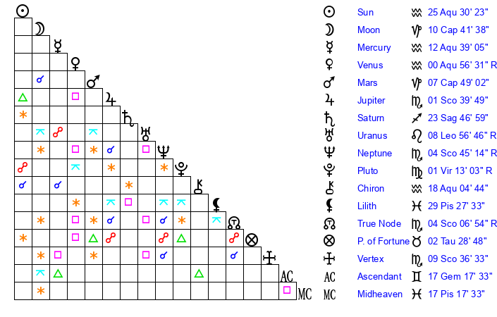 | Moon | 10 Capricorn 36 | 20 Virgo 25 | 11 Gemini 49 |