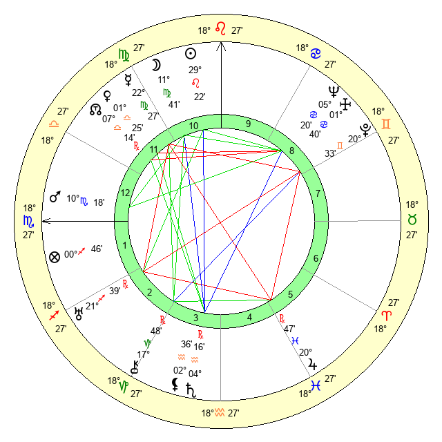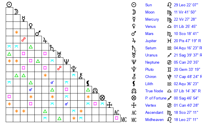 | Moon | 11 Virgo 38 | 6 Virgo 7 | 23 Aquarius 52 |