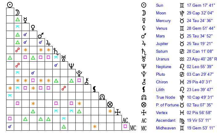 | Venus | 28 Gemini 52 | 2 Taurus 31 | 9 Scorpio 42 |