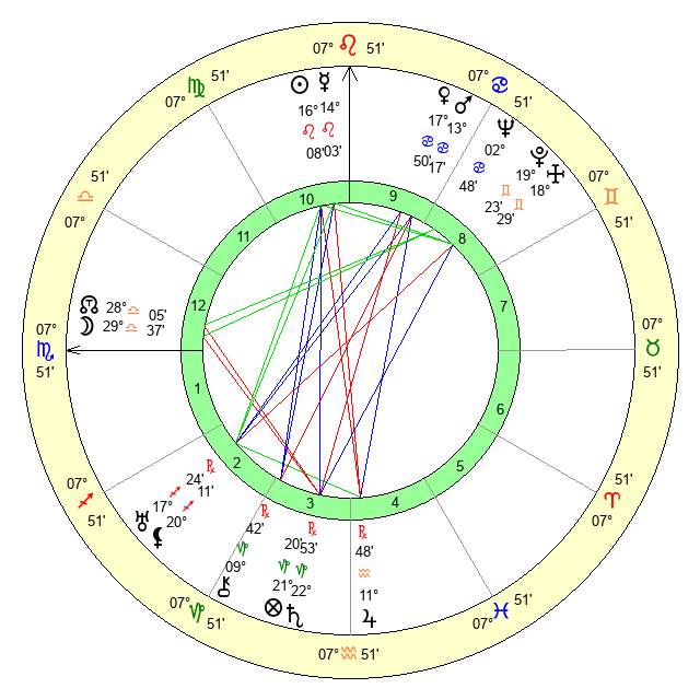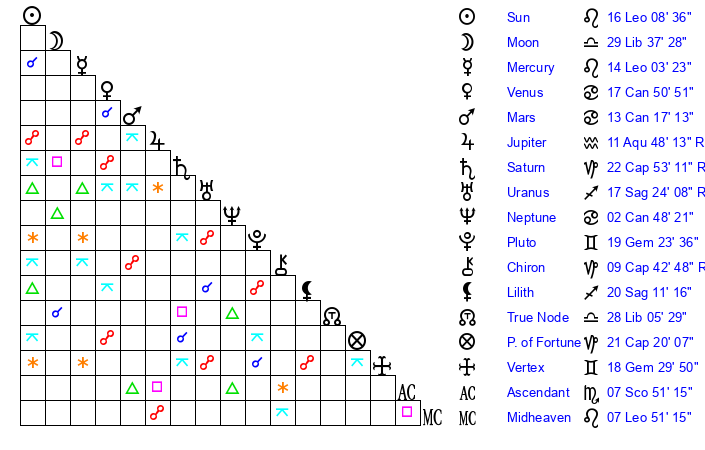 | Mercury | 14 Leo 4 | 4 Leo 23 | 16 Sagittarius 43 |