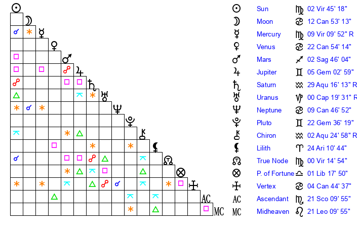 | Venus | 22 Cancer 54 | 1 Leo 13 | 19 Sagittarius 52 |