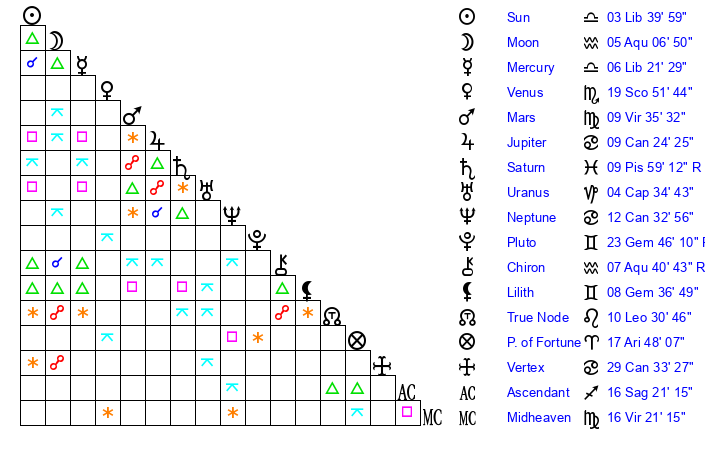 | Sun | 3 Libra 40 | 4 Libra 50 | 3 Aquarius 35 |