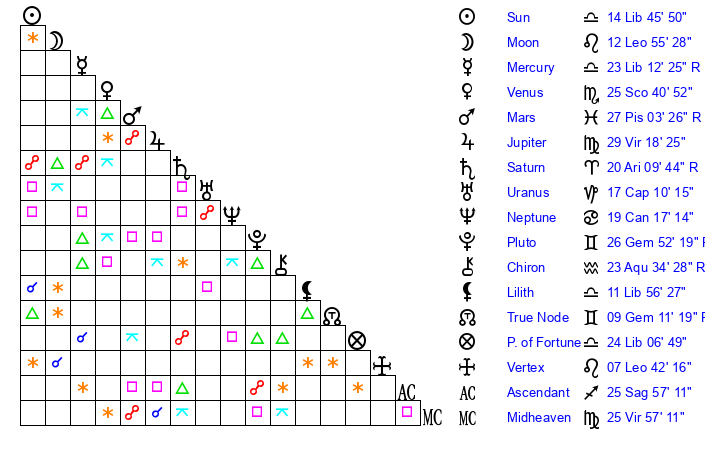 | Sun | 14 Libra 46 | 15 Libra 40 | 11 Aquarius 59 |