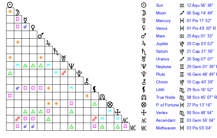 | Sun | 12 Aquarius 56 | 14 Aquarius 6 | 14 Gemini 4 |