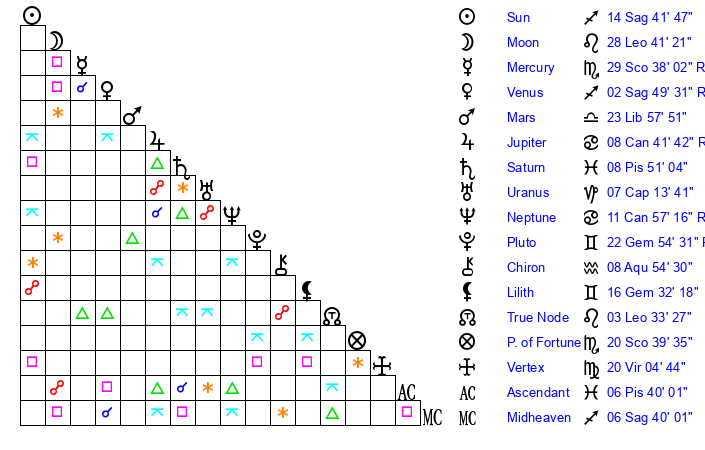 | Venus | 2 Sagittarius 50 | 8 Sagittarius 38 | 4 Pisces 16 |