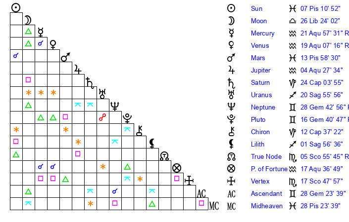 | Sun | 7 Pisces 11 | 8 Pisces 21 | 6 Cancer 59 |