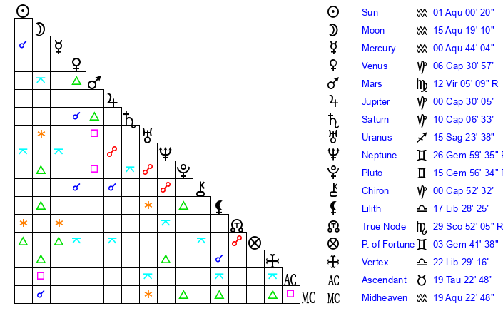 | Pluto | 15 Gemini 56 | 1 Aquarius 43 | 16 Gemini 51 |