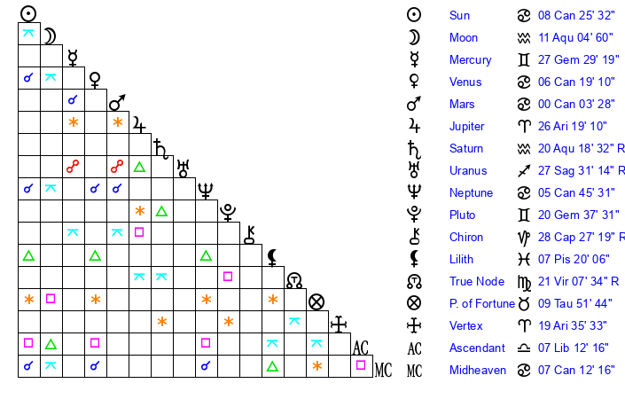 | Neptune | 5 Cancer 46 | 2 Aries 10 | 8 Cancer 6 |