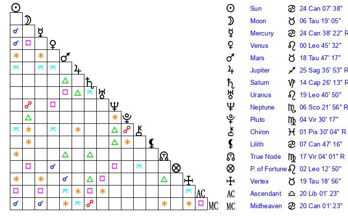 | Moon | 6 Taurus 22 | 7 Aries 7 | 12 Virgo 0 |