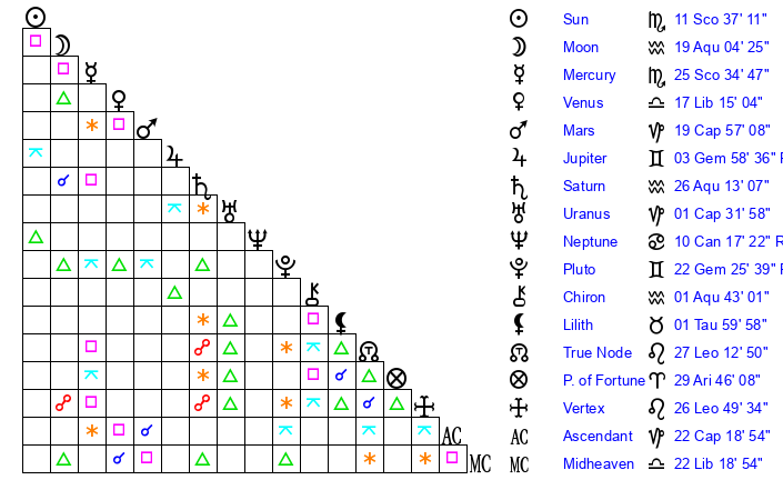 | Moon | 19 Aquarius 10 | 0 Taurus 27 | 27 Gemini 42 |
