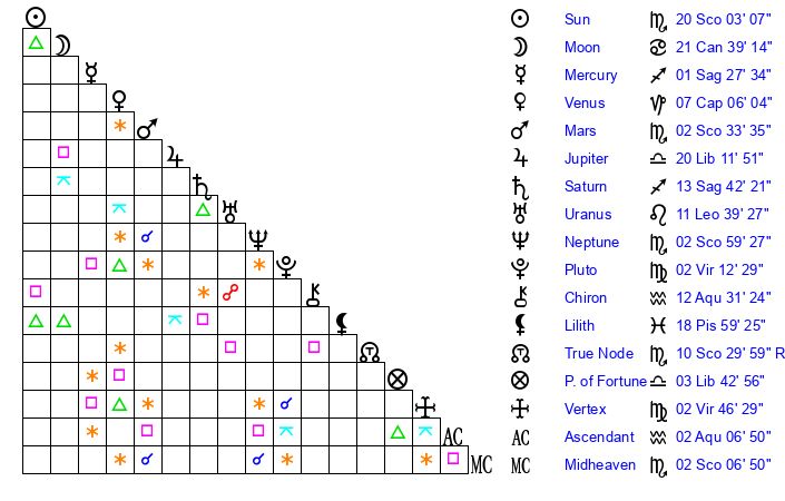 | Neptune | 2 Scorpio 59 | 29 Pisces 34 | 4 Scorpio 42 |