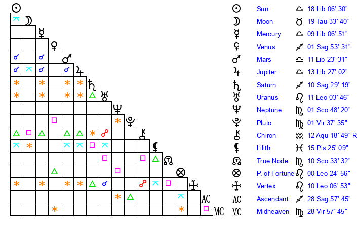 | Moon | 19 Taurus 37 | 21 Gemini 40 | 24 Scorpio 32 |
