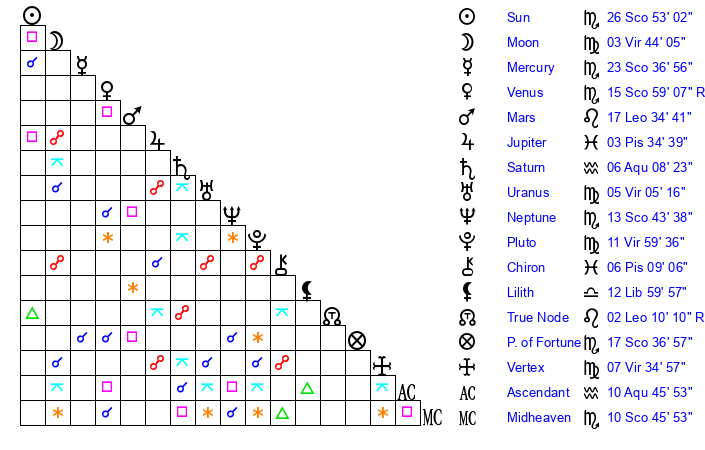 | Sun | 26 Scorpio 53 | 27 Scorpio 37 | 0 Aquarius 57 |