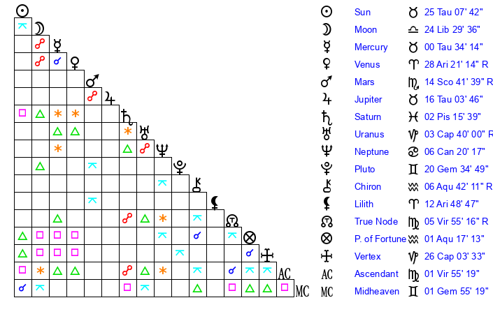 | Sun | 25 Taurus 8 | 26 Taurus 4 | 20 Virgo 13 |