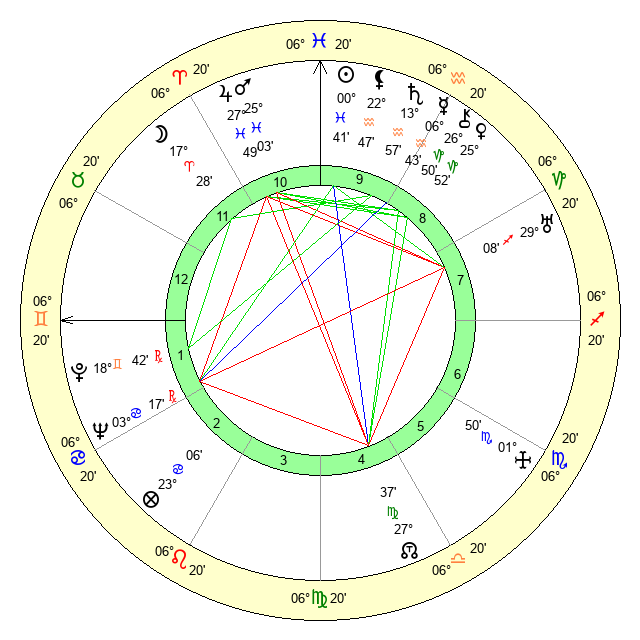 | Sun | 0 Pisces 42 | 2 Pisces 21 | 28 Gemini 56 |