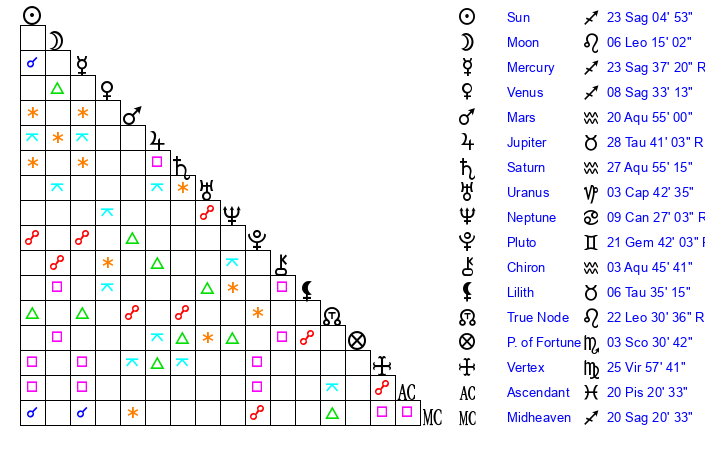 | Saturn | 28 Aquarius 22 | 25 Pisces 20 | 11 Pisces 26 |