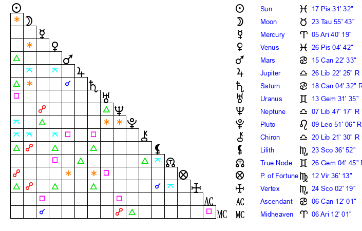 | Sun | 17 Pisces 32 | 18 Pisces 22 | 4 Gemini 50 |