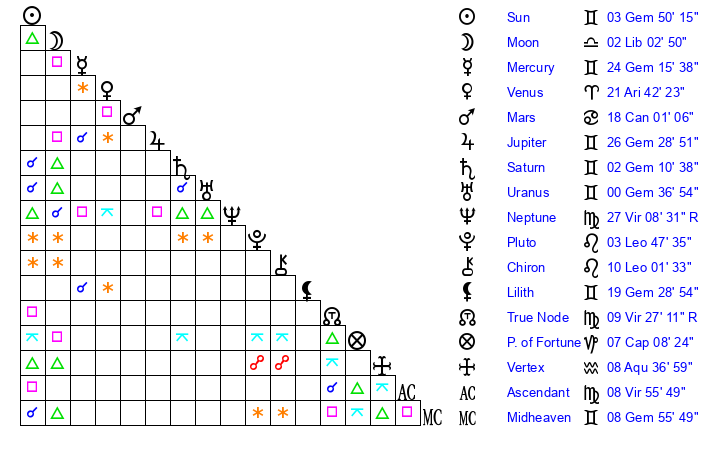 | Saturn | 2 Gemini 25 | 29 Pisces 56 | 11 Gemini 25 |