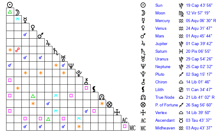 Mercury | 5 Aquarius 6 | 3 Capricorn 16 | 23 Capricorn 33 |