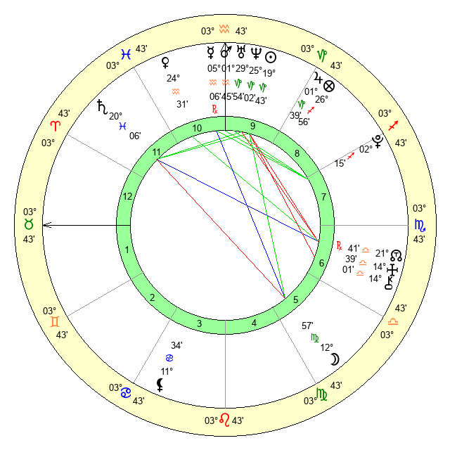 Moon | 12 Virgo 57 | 9 Gemini 27 | 5 Libra 0 |