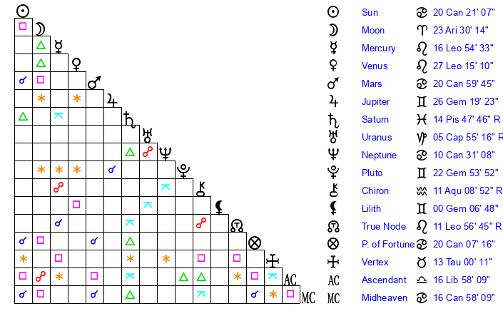 | Moon | 23 Aries 35 | 26 Aquarius 16 | 19 Leo 48 |
