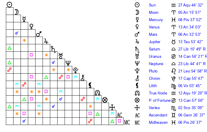 Sun | 27 Aquarius 44 | 28 Aquarius 16 | 9 Taurus 4 |