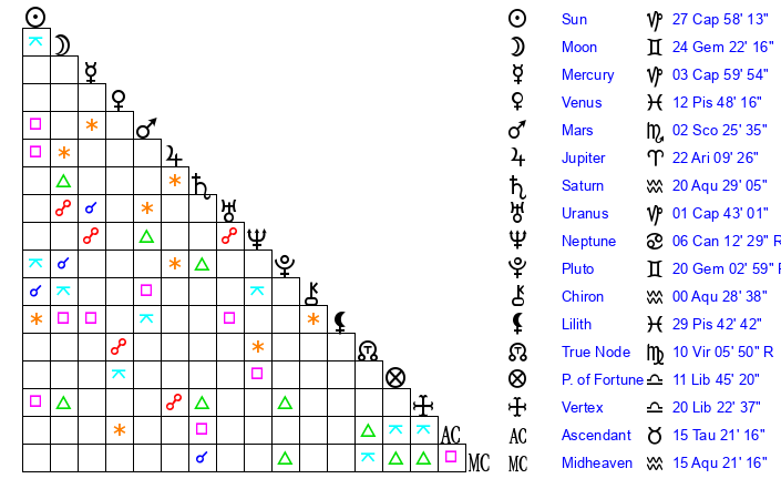 | Pluto | 20 Gemini 3 | 1 Aquarius 37 | 20 Gemini 38 |