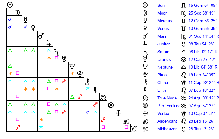 | Sun | 15 Gemini 54 | 16 Gemini 14 | 25 Leo 40 |