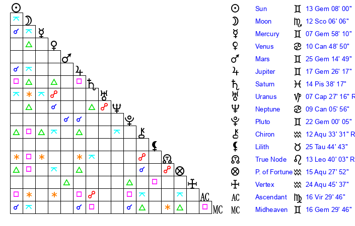 | Sun | 13 Gemini 8 | 14 Gemini 19 | 7 Libra 36 |