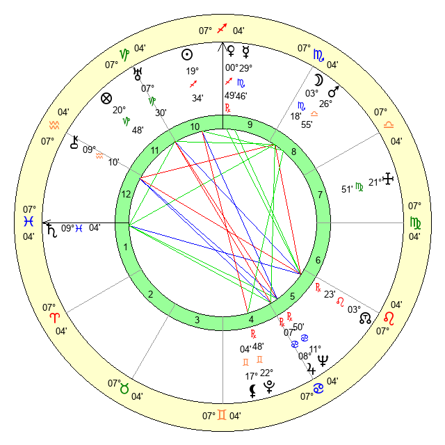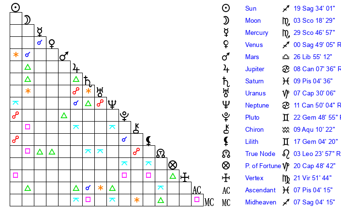 | Mercury | 29 Scorpio 47 | 7 Sagittarius 24 | 21 Pisces 46 |