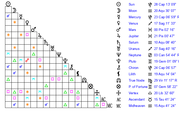 | Saturn | 10 Aquarius 34 | 16 Pisces 5 | 21 Aquarius 20 |