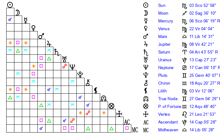 | Sun | 3 Scorpio 53 | 4 Scorpio 32 | 2 Pisces 27 |