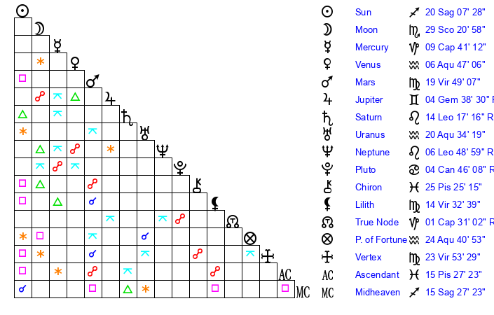 | Venus | 6 Aquarius 47 | 14 Sagittarius 56 | 25 Aquarius 6 |