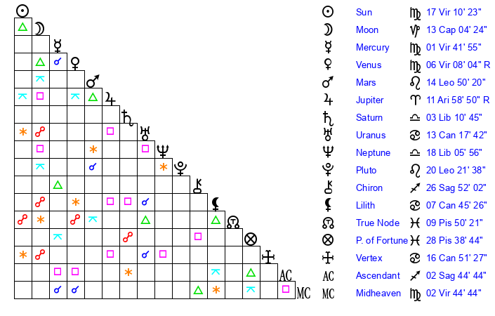 | Moon | 13 Capricorn 3 | 27 Aries 58 | 21 Virgo 51 |