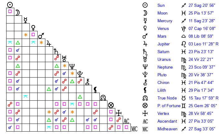 | Pluto | 20 Virgo 39 | 0 Aquarius 42 | 19 Virgo 55 |