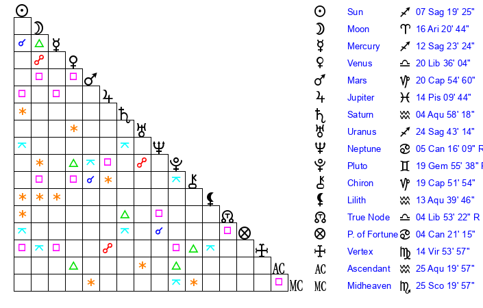 | Moon | 16 Aries 23 | 9 Aries 25 | 13 Libra 5 |