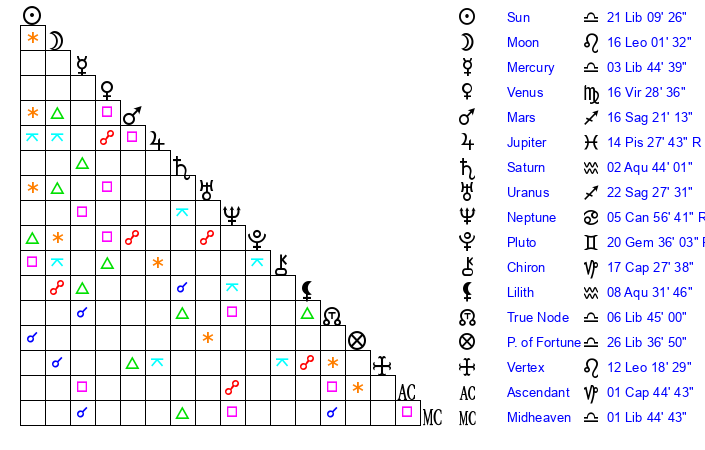 | Venus | 16 Virgo 28 | 2 Libra 15 | 18 Capricorn 32 |