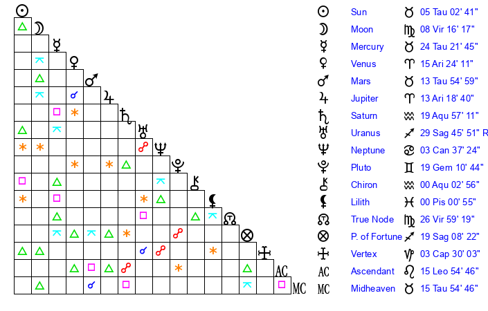 | Sun | 5 Taurus 2 | 5 Taurus 44 | 1 Virgo 4 |