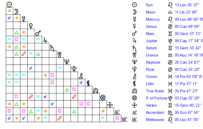| Sun | 13 Leo 35 | 14 Leo 29 | 3 Sagittarius 51 |
