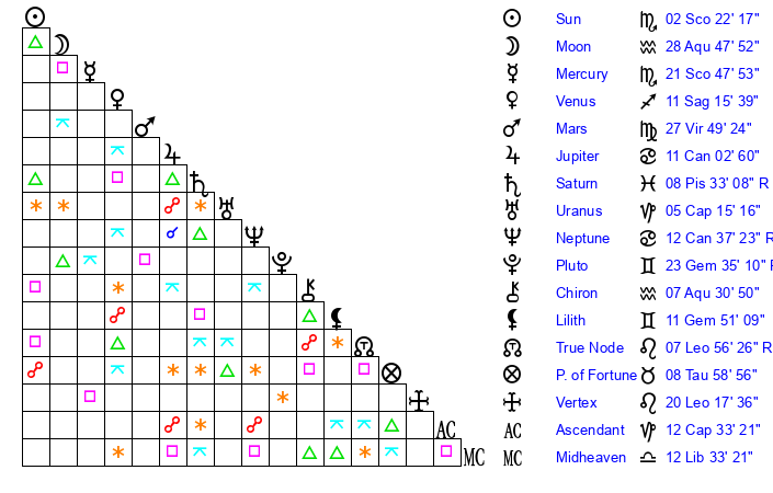 | Sun | 2 Scorpio 22 | 3 Scorpio 32 | 2 Pisces 56 |
