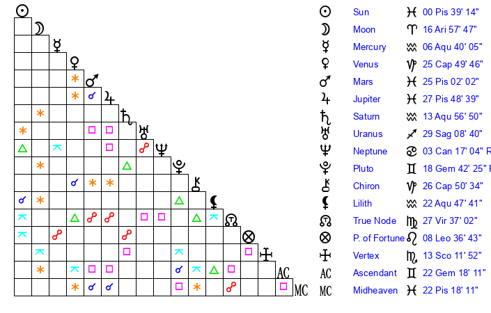 | Sun | 0 Pisces 39 | 2 Pisces 18 | 28 Gemini 53 |