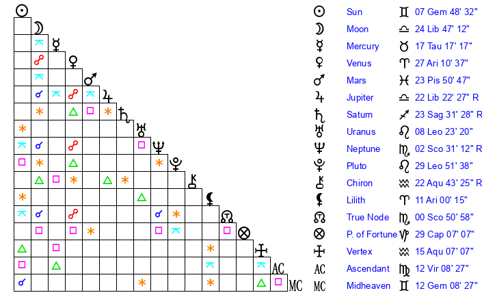 | Jupiter | 22 Libra 13 | 27 Gemini 29 | 24 Libra 40 |