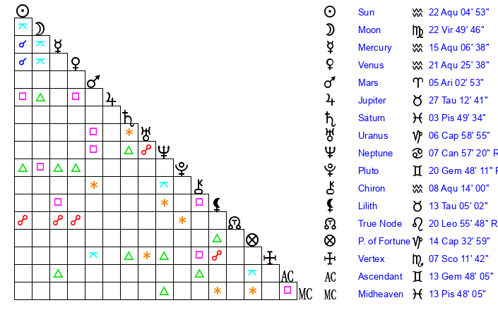 | Sun | 22 Aquarius 5 | 23 Aquarius 13 | 18 Gemini 53 |