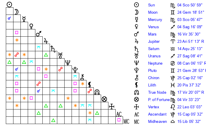 | Moon | 24 Gemini 17 | 24 Capricorn 21 | 11 Sagittarius 3 |
