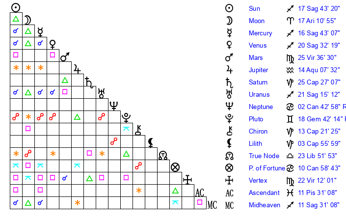 | Sun | 17 Sagittarius 43 | 18 Sagittarius 53 | 21 Aries 36 |