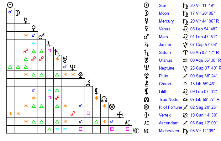 Sun | 20 Virgo 12 | 20 Virgo 11 | 18 Libra 39 |