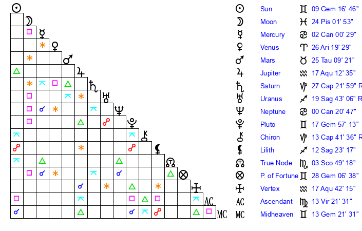 | Pluto | 17 Gemini 58 | 3 Aquarius 38 | 19 Gemini 41 |