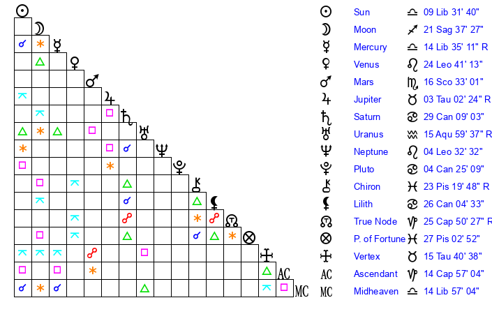 | Moon | 21 Sagittarius 34 | 16 Aquarius 23 | 14 Sagittarius 37 |