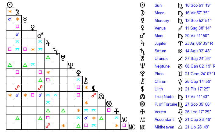 | Mars | 20 Virgo 12 | 29 Scorpio 24 | 20 Scorpio 34 |