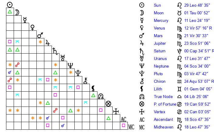 | Mercury | 11 Leo 24 | 13 Leo 10 | 27 Scorpio 14 |